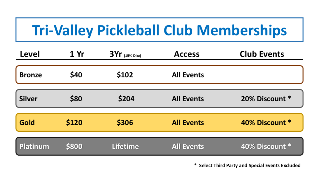 Please Sign Up and support the Tri-Valley Pickleball Club. The more people we have, the stronger our voice will be with the municipalities of the Tri-valley to provide more Great Pickleball Opportunities for everyone.